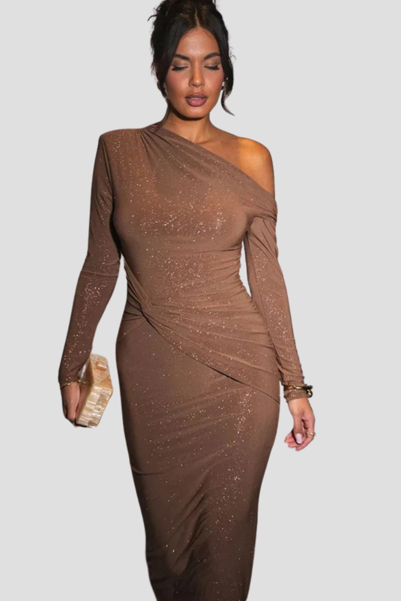 This one-shoulder glitter dress hugs your curves and sparkles under the light — made to turn heads at every special occasion.