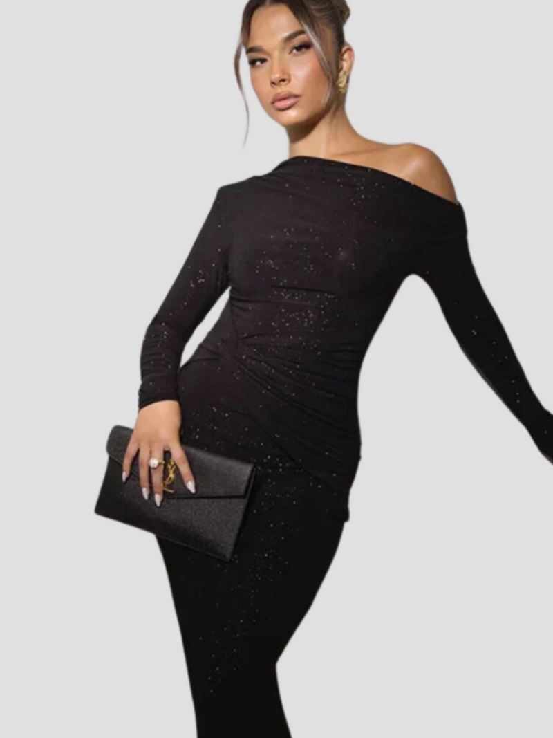 Ceyana Evening Dress | One-Shoulder Black Glitter Bodycon Dress