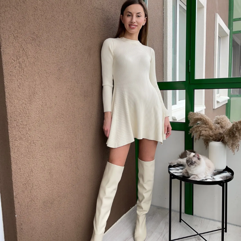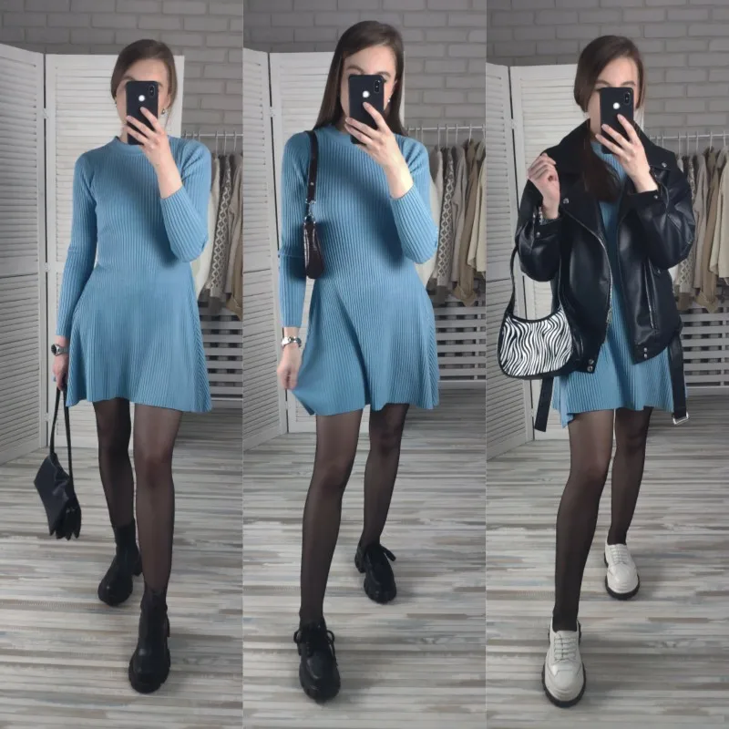 This ribbed long-sleeve knit dress offers a flattering fit-and-flare silhouette, combining warmth and style for any casual or formal occasion.