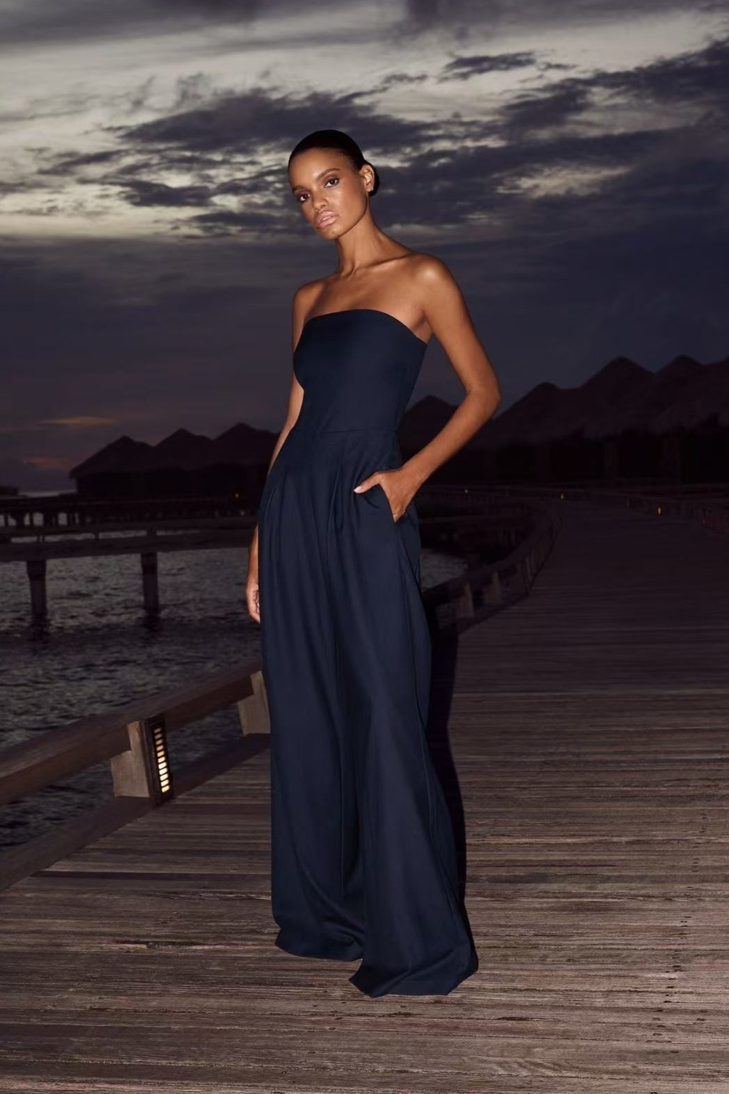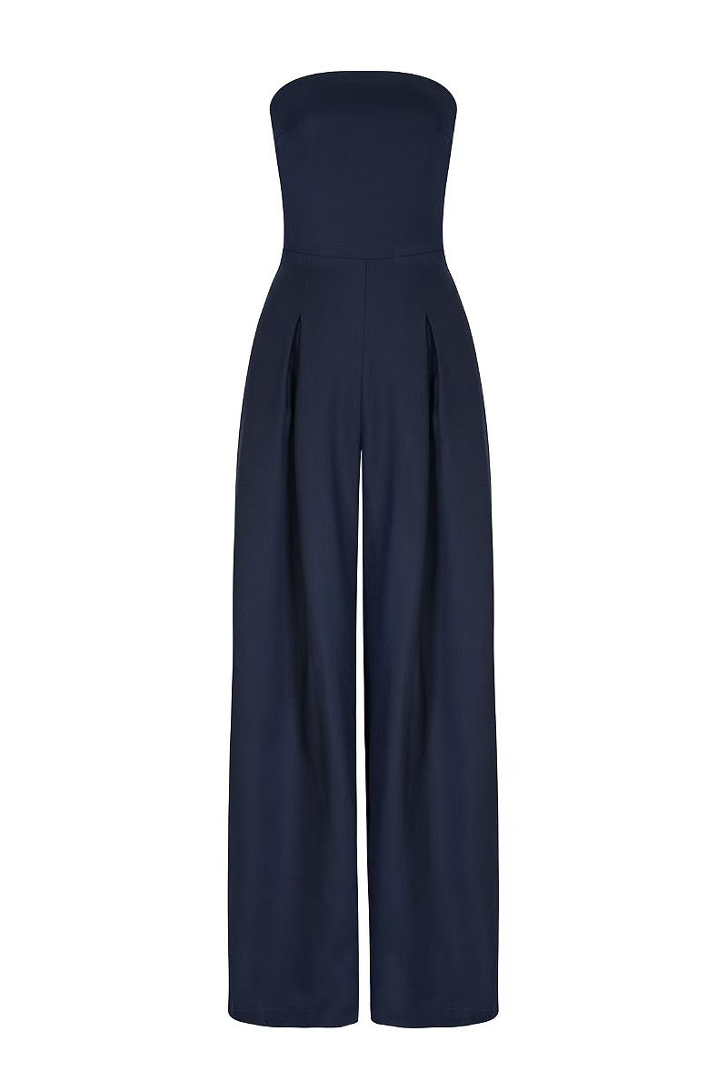 This navy strapless jumpsuit combines sleek sophistication with a relaxed fit. Its wide-leg silhouette and pleated details offer a flattering, stylish look for evening events or upscale gatherings.