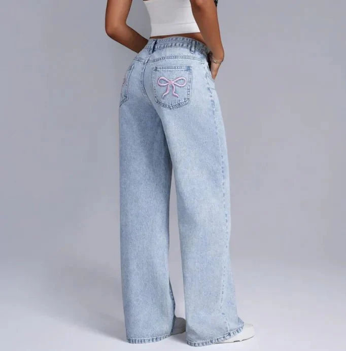 These wide-leg jeans combine chic comfort with standout style. Featuring delicate pink bow embroidery on the back pockets, they’re perfect for casual or dressy occasions.