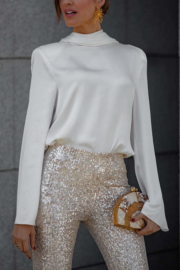 Add glamour to your wardrobe with these sparkling flare pants, featuring a high-rise fit and comfortable elastic waist for a dazzling yet comfy look.